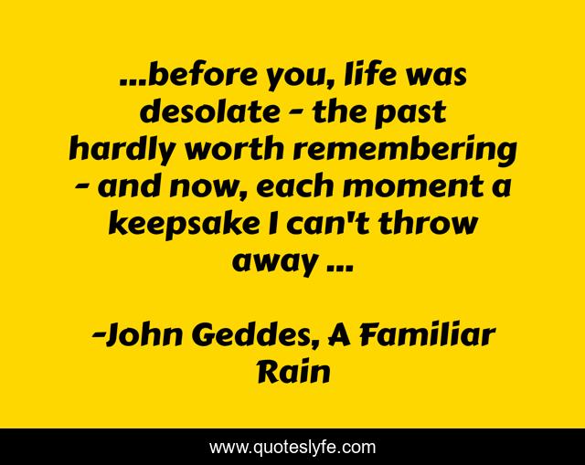 This page presents the quote "...before you, life was desolate - the past hardly worth remembering - and now, each moment a keepsake I can't throw away ...". Author of this quote is John Geddes, A Familiar Rain. This quote is about life, moments, memories, desolation, poetry, the-past, keepsakes,.