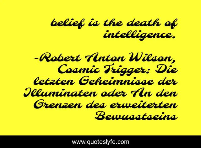 "Robert Anton Wilson, Cosmic Trigger: Die letzten Geheimnisse der Illuminaten oder An den Grenzen des erweiterten Bewusstseins Quotes." Quoteslyfe.com, 2025. Tue. 09 Dec. 2025. <https://www.quoteslyfe.com/quote/belief-is-the-death-of-intelligence-7256>.