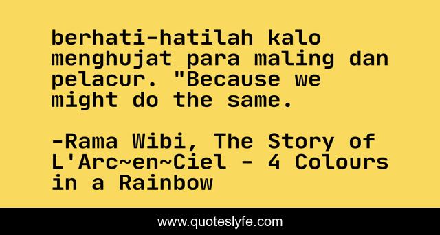 This page presents the quote "berhati-hatilah kalo menghujat para maling dan pelacur. "Because we might do the same.". Author of this quote is Rama Wibi, The Story of L'Arc~en~Ciel - 4 Colours in a Rainbow. .