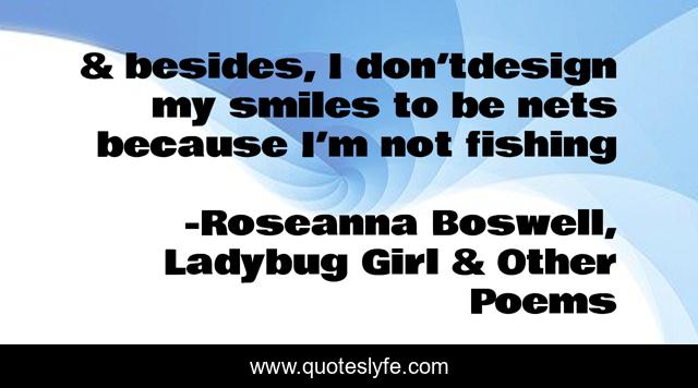 This page presents the quote "& besides, I don’tdesign my smiles to be nets because I’m not fishing". Author of this quote is Roseanna Boswell, Ladybug Girl & Other Poems. This quote is about poetry, feminist,.