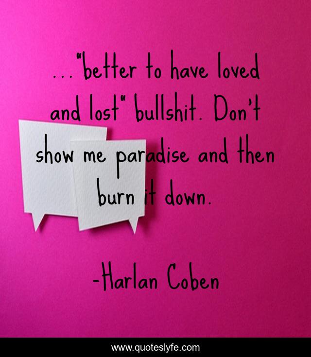 This page presents the quote "..."better to have loved and lost" bullshit. Don't show me paradise and then burn it down.". Author of this quote is Harlan Coben. This quote is about memorable, love, affection,.