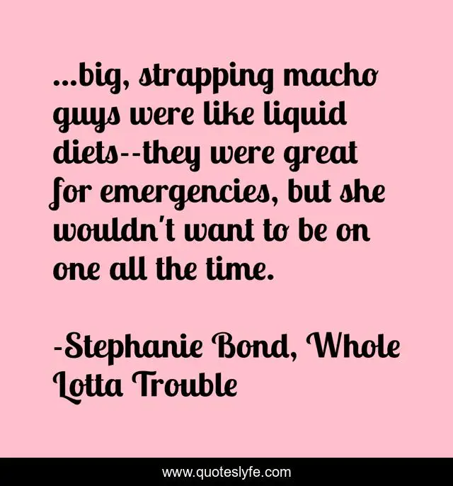 This page presents the quote "...big, strapping macho guys were like liquid diets--they were great for emergencies, but she wouldn't want to be on one all the time.". Author of this quote is Stephanie Bond, Whole Lotta Trouble. This quote is about romance, comedy,.
