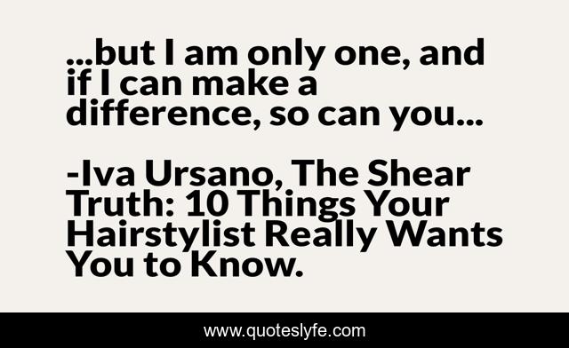 This page presents the quote "...but I am only one, and if I can make a difference, so can you...". Author of this quote is Iva Ursano, The Shear Truth: 10 Things Your Hairstylist Really Wants You to Know.. This quote is about confidence, inspirational, positive, motivational, optimistic, life-lessons, enthusiasm,.