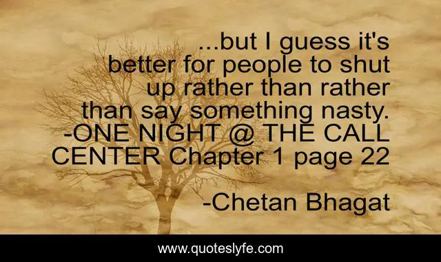 This page presents the quote "...but I guess it's better for people to shut up rather than rather than say something nasty. -ONE NIGHT @ THE CALL CENTER Chapter 1 page 22". Author of this quote is Chetan Bhagat. .