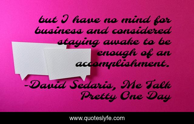 This page presents the quote "but I have no mind for business and considered staying awake to be enough of an accomplishment.". Author of this quote is David Sedaris, Me Talk Pretty One Day. This quote is about lazy, inspiration, humor, motivation, work-ethic,.