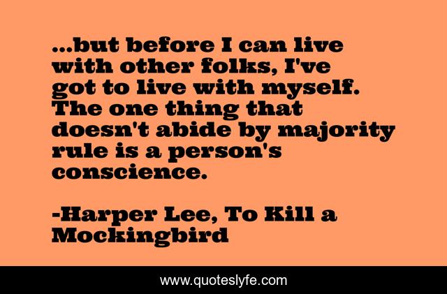 This page presents the quote "...but before I can live with other folks, I've got to live with myself. The one thing that doesn't abide by majority rule is a person's conscience.". Author of this quote is Harper Lee, To Kill a Mockingbird. This quote is about conscience, tokillamockingbird, live, harper-lee, myself,.