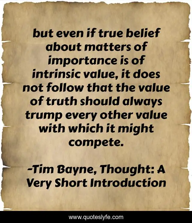This page presents the quote "but even if true belief about matters of importance is of intrinsic value, it does not follow that the value of truth should always trump every other value with which it might compete.". Author of this quote is Tim Bayne, Thought: A Very Short Introduction. This quote is about thought, truth, belief, value,.