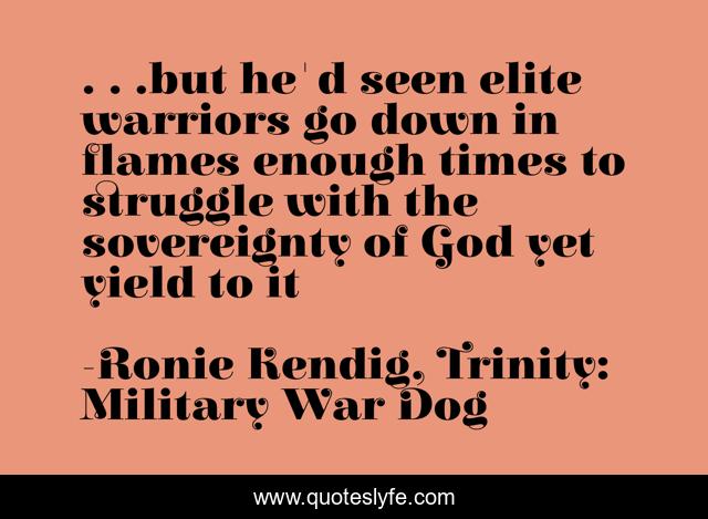 This page presents the quote ". . .but he'd seen elite warriors go down in flames enough times to struggle with the sovereignty of God yet yield to it". Author of this quote is Ronie Kendig, Trinity: Military War Dog. This quote is about christian-lit, thriller, fiction,.