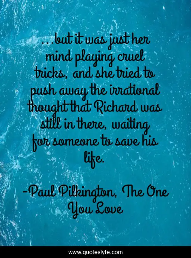 This page presents the quote "...but it was just her mind playing cruel tricks, and she tried to push away the irrational thought that Richard was still in there, waiting for someone to save his life.". Author of this quote is Paul Pilkington, The One You Love. This quote is about murder, murder-mystery, illusion, mind-tricks, the-one-you-love,.