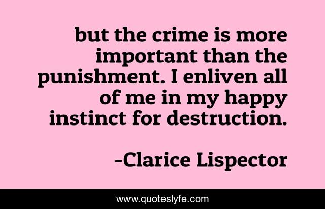 This page presents the quote "but the crime is more important than the punishment. I enliven all of me in my happy instinct for destruction.". Author of this quote is Clarice Lispector. This quote is about death, freudian, crime, pscyhoanalysis, instinct, punishment, happiness, destruction,.