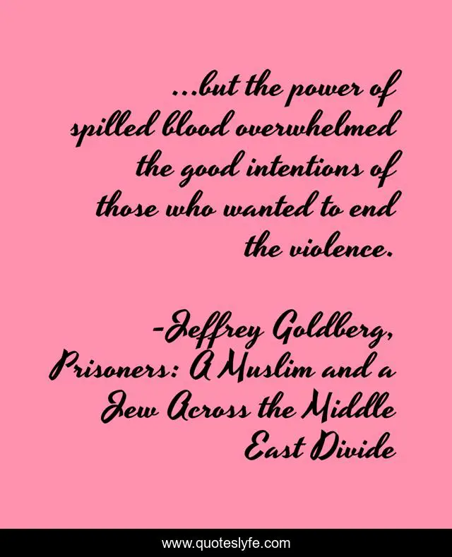 This page presents the quote "...but the power of spilled blood overwhelmed the good intentions of those who wanted to end the violence.". Author of this quote is Jeffrey Goldberg, Prisoners: A Muslim and a Jew Across the Middle East Divide. This quote is about hatred, history-repeating-itself, war,.