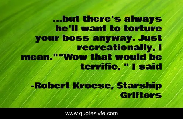 This page presents the quote "...but there's always he'll want to torture your boss anyway. Just recreationally, I mean.""Wow that would be terrific, " I said". Author of this quote is Robert Kroese, Starship Grifters. This quote is about satire, science-fiction, toture,.