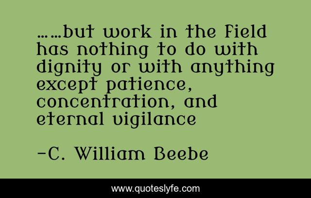 This page presents the quote "……but work in the field has nothing to do with dignity or with anything except patience, concentration, and eternal vigilance". Author of this quote is C. William Beebe. .