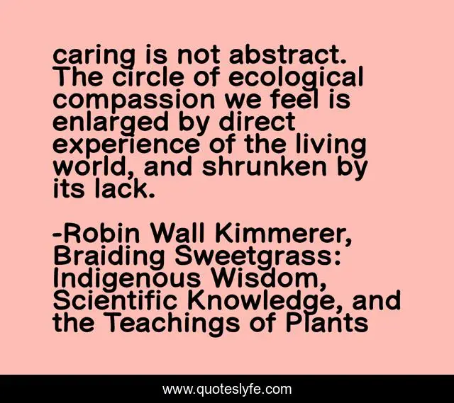 "Robin Wall Kimmerer, Braiding Sweetgrass: Indigenous Wisdom, Scientific Knowledge, and the Teachings of Plants Quotes." Quoteslyfe.com, 2025. Fri. 05 Dec. 2025. <https://www.quoteslyfe.com/quote/caring-is-not-abstract-The-circle-of-135185>.