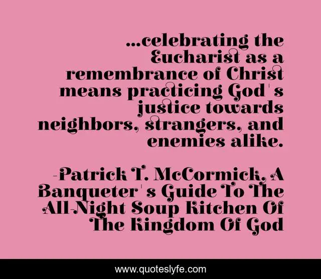 This page presents the quote "...celebrating the Eucharist as a remembrance of Christ means practicing God's justice towards neighbors, strangers, and enemies alike.". Author of this quote is Patrick T. McCormick, A Banqueter's Guide To The All-Night Soup Kitchen Of The Kingdom Of God. This quote is about justice, eucharist, theology,.