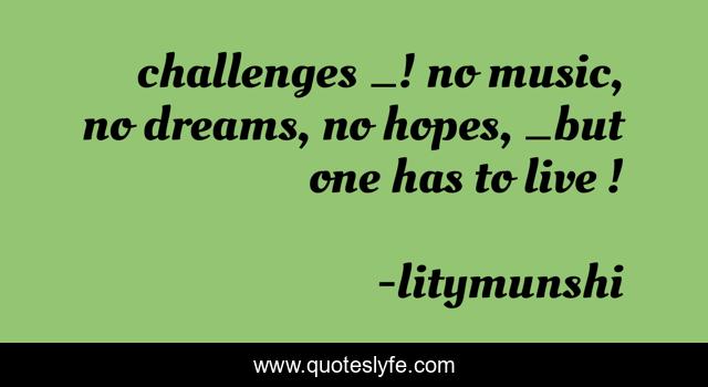 This page presents the quote "challenges _! no music, no dreams, no hopes, _but one has to live !". Author of this quote is litymunshi. This quote is about life, challenges, music, hopes, beginning, dreams,.