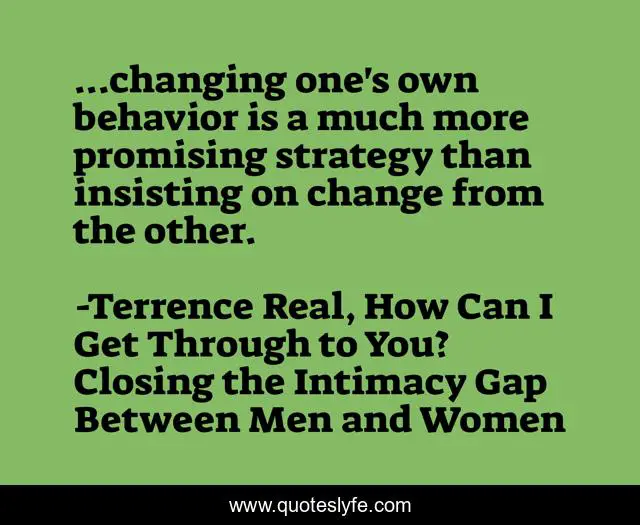 This page presents the quote "...changing one's own behavior is a much more promising strategy than insisting on change from the other.". Author of this quote is Terrence Real, How Can I Get Through to You? Closing the Intimacy Gap Between Men and Women. .