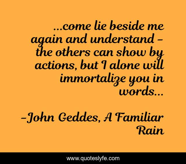 This page presents the quote "...come lie beside me again and understand - the others can show by actions, but I alone will immortalize you in words...". Author of this quote is John Geddes, A Familiar Rain. This quote is about immortalize, love-lost, poetry, understanding, words, wisdom,.