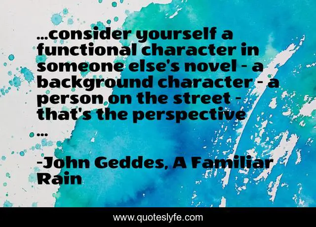 This page presents the quote "...consider yourself a functional character in someone else's novel - a background character - a person on the street - that's the perspective ...". Author of this quote is John Geddes, A Familiar Rain. This quote is about background-character, writing-process, perspective, writing-advice,.