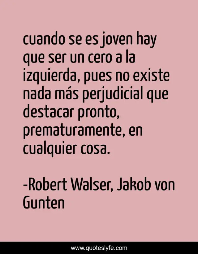 This page presents the quote "cuando se es joven hay que ser un cero a la izquierda, pues no existe nada más perjudicial que destacar pronto, prematuramente, en cualquier cosa.". Author of this quote is Robert Walser, Jakob von Gunten. This quote is about sabiduría, wisdom,.