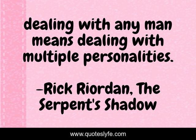 This page presents the quote "dealing with any man means dealing with multiple personalities.". Author of this quote is Rick Riordan, The Serpent's Shadow. This quote is about relationships, love, affection,.