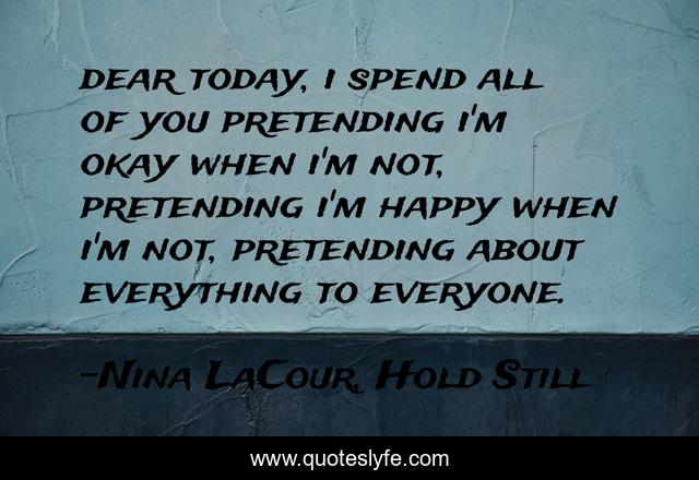 This page presents the quote "dear today, i spend all of you pretending i'm okay when i'm not, pretending i'm happy when i'm not, pretending about everything to everyone.". Author of this quote is Nina LaCour, Hold Still. This quote is about faking-it, happiness, okay, pretending, letters,.