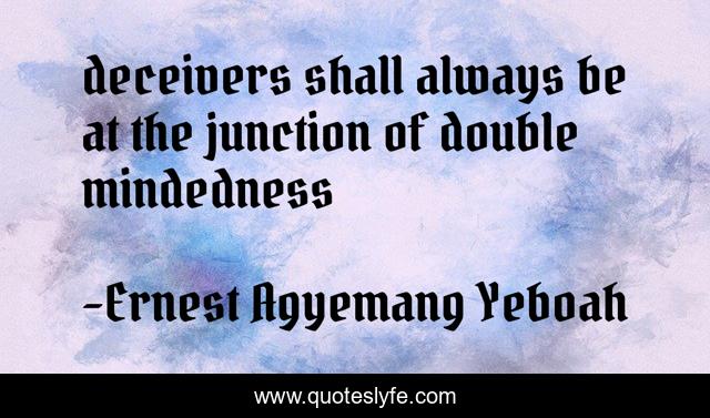 This page presents the quote "deceivers shall always be at the junction of double mindedness". Author of this quote is Ernest Agyemang Yeboah. This quote is about deception, marital-problems, lessons-of-life, marraige-issues, cheating-boyfriend, cheating-in-relationships, cheating-spouse, love, love-hurt-feelings,.