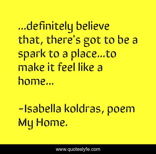 This page presents the quote "...definitely believe that, there's got to be a spark to a place...to make it feel like a home...". Author of this quote is Isabella koldras, poem My Home.. This quote is about faith, not-taking-for-granted, belief, consciousness, knowledge, acceptance, like-it-is, idea, conclusion,.