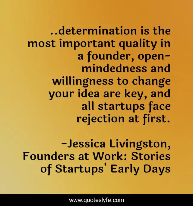 This page presents the quote "..determination is the most important quality in a founder, open-mindedness and willingness to change your idea are key, and all startups face rejection at first.". Author of this quote is Jessica Livingston, Founders at Work: Stories of Startups' Early Days. This quote is about startups, determination,.