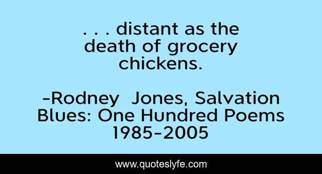 This page presents the quote ". . . distant as the death of grocery chickens.". Author of this quote is Rodney Jones, Salvation Blues: One Hundred Poems 1985-2005. .