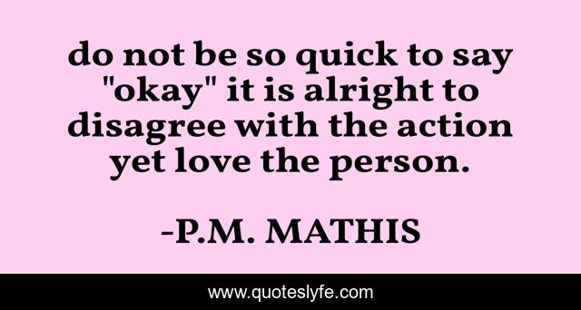 This page presents the quote "do not be so quick to say "okay" it is alright to disagree with the action yet love the person.". Author of this quote is P.M. MATHIS. This quote is about action, disagree, love, affection,.