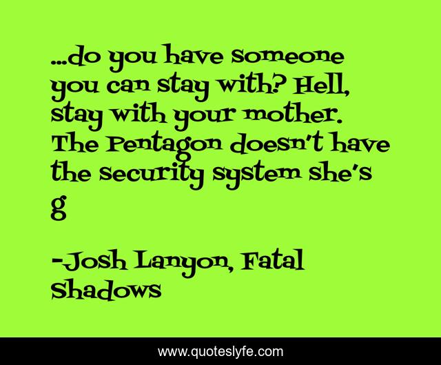 This page presents the quote "...do you have someone you can stay with? Hell, stay with your mother. The Pentagon doesn’t have the security system she’s g". Author of this quote is Josh Lanyon, Fatal Shadows. This quote is about dark-humor, serial-killers, mothers,.
