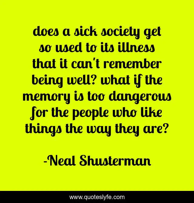 This page presents the quote "does a sick society get so used to its illness that it can't remember being well? what if the memory is too dangerous for the people who like things the way they are?". Author of this quote is Neal Shusterman. This quote is about remember, people, dangerous, well, society, benefit, sick, unwholly, like,.