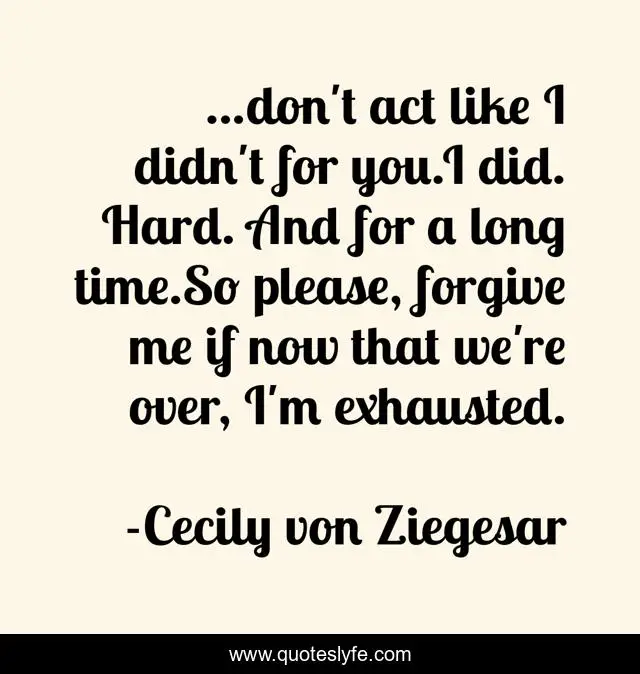 This page presents the quote "...don't act like I didn't for you.I did. Hard. And for a long time.So please, forgive me if now that we're over, I'm exhausted.". Author of this quote is Cecily von Ziegesar. This quote is about despressing, gossip-girl, sad,.