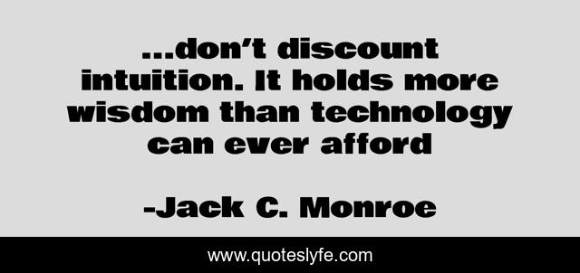 This page presents the quote "...don’t discount intuition. It holds more wisdom than technology can ever afford". Author of this quote is Jack C. Monroe. This quote is about fiction, young-adult, wisdom,.