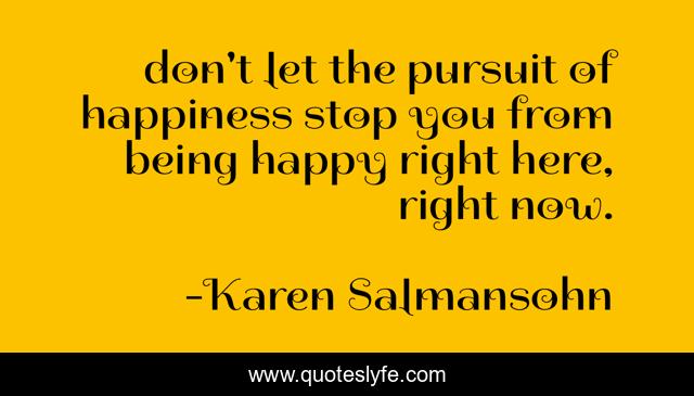 This page presents the quote "don't let the pursuit of happiness stop you from being happy right here, right now.". Author of this quote is Karen Salmansohn. This quote is about enthusiasm, life-and-living, happiness, inspirational,.