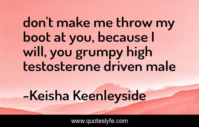This page presents the quote "don't make me throw my boot at you, because I will, you grumpy high testosterone driven male". Author of this quote is Keisha Keenleyside. This quote is about funny, random, comedy, humour,.