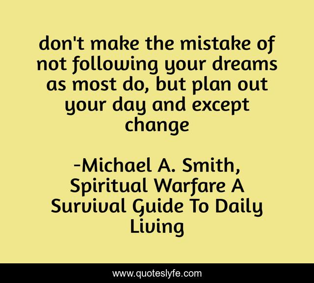 This page presents the quote "don't make the mistake of not following your dreams as most do, but plan out your day and except change". Author of this quote is Michael A. Smith, Spiritual Warfare A Survival Guide To Daily Living. This quote is about enthusiasm, learned, inspirational, life-lessons,.