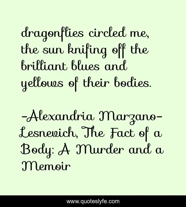 "Alexandria Marzano-Lesnevich, The Fact of a Body: A Murder and a Memoir Quotes." Quoteslyfe.com, 2025. Mon. 08 Dec. 2025. <https://www.quoteslyfe.com/quote/dragonflies-circled-me-the-sun-knifing-off-60934>.