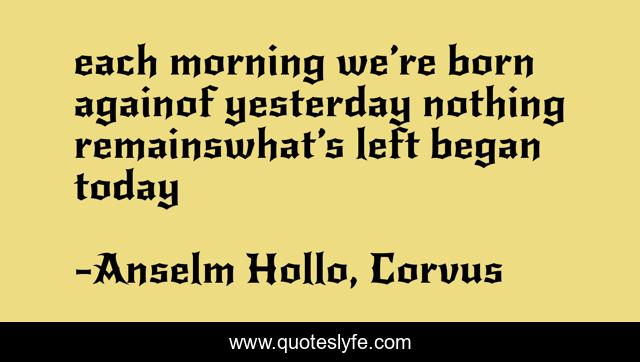 "Anselm Hollo, Corvus Quotes." Quoteslyfe.com, 2025. Sat. 06 Dec. 2025. <https://www.quoteslyfe.com/quote/each-morning-we-re-born-againof-yesterday-125318>.