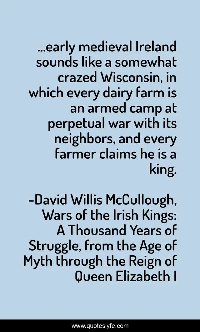 This page presents the quote "...early medieval Ireland sounds like a somewhat crazed Wisconsin, in which every dairy farm is an armed camp at perpetual war with its neighbors, and every farmer claims he is a king.". Author of this quote is David Willis McCullough, Wars of the Irish Kings: A Thousand Years of Struggle, from the Age of Myth through the Reign of Queen Elizabeth I. This quote is about ireland, history,.
