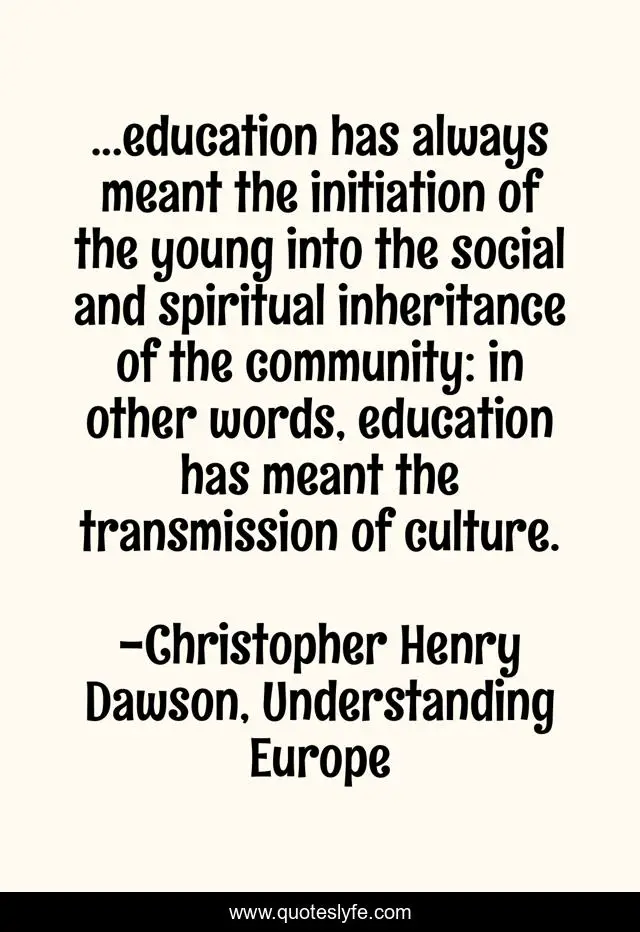 This page presents the quote "...education has always meant the initiation of the young into the social and spiritual inheritance of the community: in other words, education has meant the transmission of culture.". Author of this quote is Christopher Henry Dawson, Understanding Europe. .