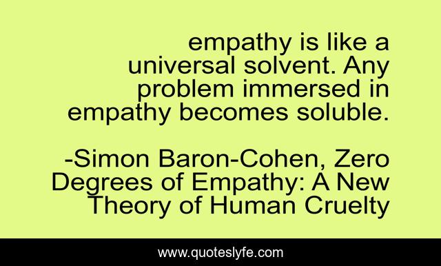 This page presents the quote "empathy is like a universal solvent. Any problem immersed in empathy becomes soluble.". Author of this quote is Simon Baron-Cohen, Zero Degrees of Empathy: A New Theory of Human Cruelty. .