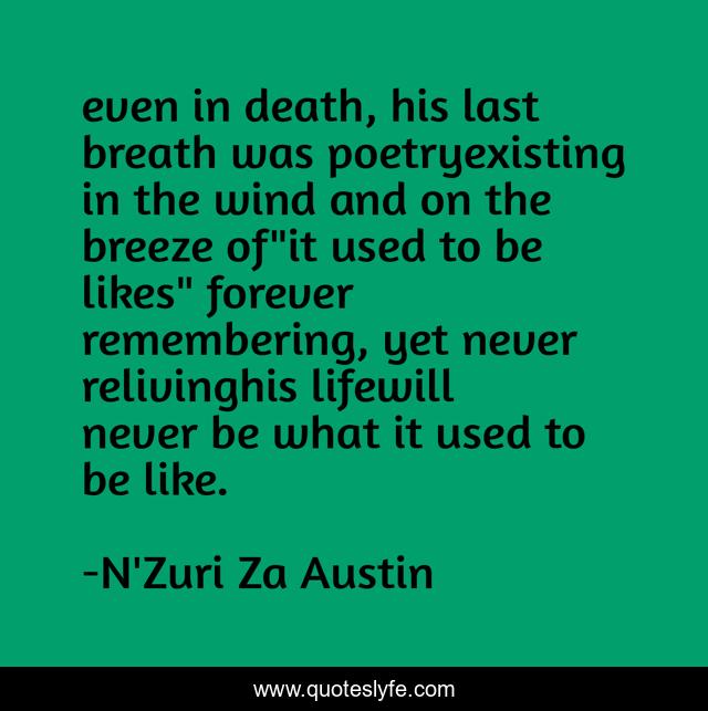 This page presents the quote "even in death, his last breath was poetryexisting in the wind and on the breeze of"it used to be likes" forever remembering, yet never relivinghis lifewill never be what it used to be like.". Author of this quote is N'Zuri Za Austin. This quote is about remembering, past, life, poetry, existing, poetry-of-life, reliving-the-past, past-and-future,.