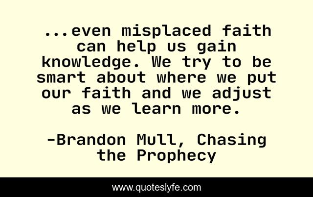This page presents the quote "...even misplaced faith can help us gain knowledge. We try to be smart about where we put our faith and we adjust as we learn more.". Author of this quote is Brandon Mull, Chasing the Prophecy. This quote is about faith, adjusting, doubt, learning,.