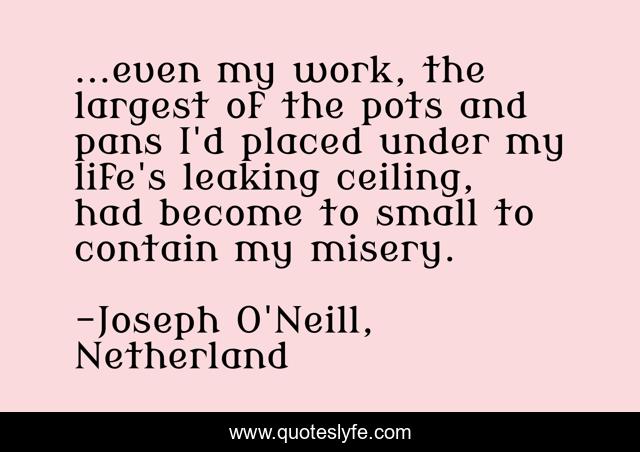 This page presents the quote "...even my work, the largest of the pots and pans I'd placed under my life's leaking ceiling, had become to small to contain my misery.". Author of this quote is Joseph O'Neill, Netherland. .