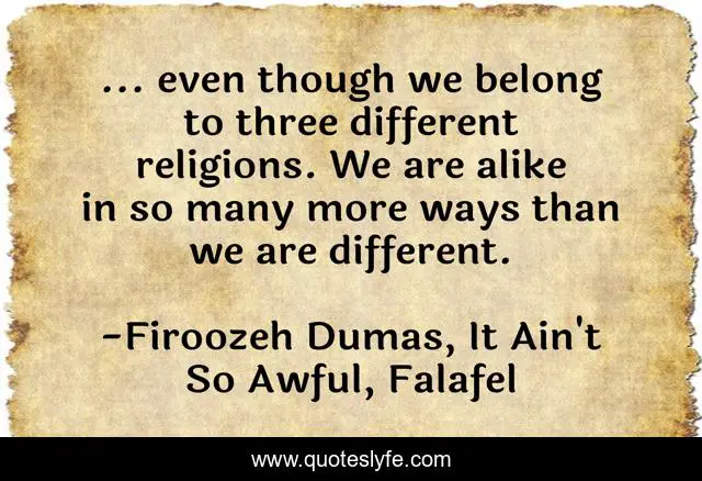 This page presents the quote "... even though we belong to three different religions. We are alike in so many more ways than we are different.". Author of this quote is Firoozeh Dumas, It Ain't So Awful, Falafel. .