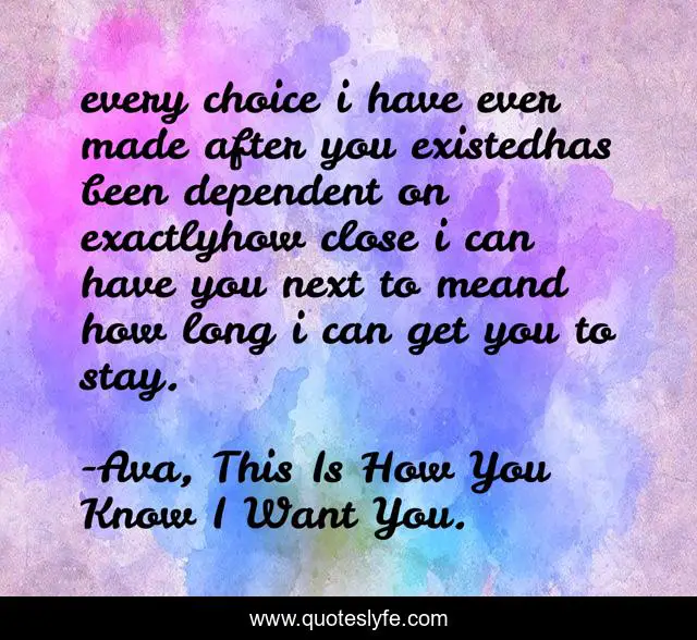 This page presents the quote "every choice i have ever made after you existedhas been dependent on exactlyhow close i can have you next to meand how long i can get you to stay.". Author of this quote is Ava, This Is How You Know I Want You.. This quote is about desire, poets, love, poetry, feelings, lust, quotes, infatuation, prose,.