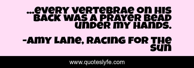 This page presents the quote "...every vertebrae on his back was a prayer bead under my hands.". Author of this quote is Amy Lane, Racing for the Sun. This quote is about love, affection, romance-novels,.