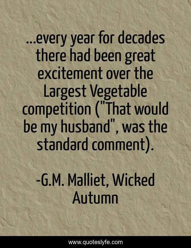 This page presents the quote "...every year for decades there had been great excitement over the Largest Vegetable competition ("That would be my husband", was the standard comment).". Author of this quote is G.M. Malliet, Wicked Autumn. This quote is about humorous, husbands, humor, competition, husband,.